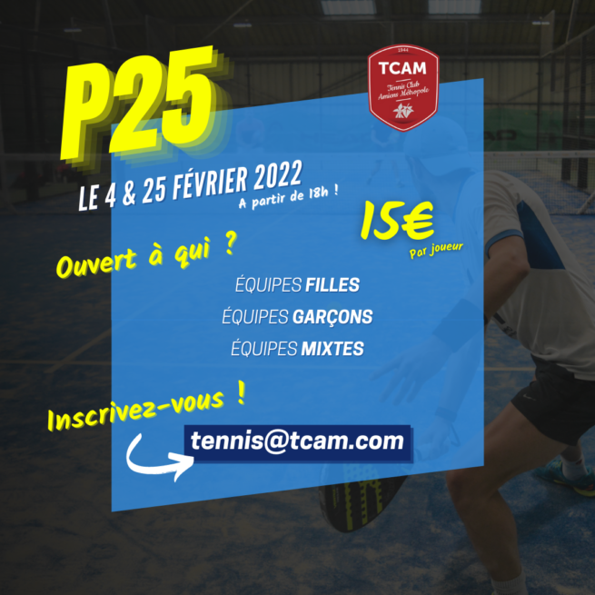 Chers adhérents, En février, le club organise 2 tournois de padel P25. Les tournois auront lieu le vendredi 4 et vendredi 25 février 2022. Une bonne occasion de se mettre au défi et de découvrir la compétition ! Les deux compétitions débuteront à 18h et sont ouvertes aux équipes filles, garçons et mixtes.   INFORMATIONS […]